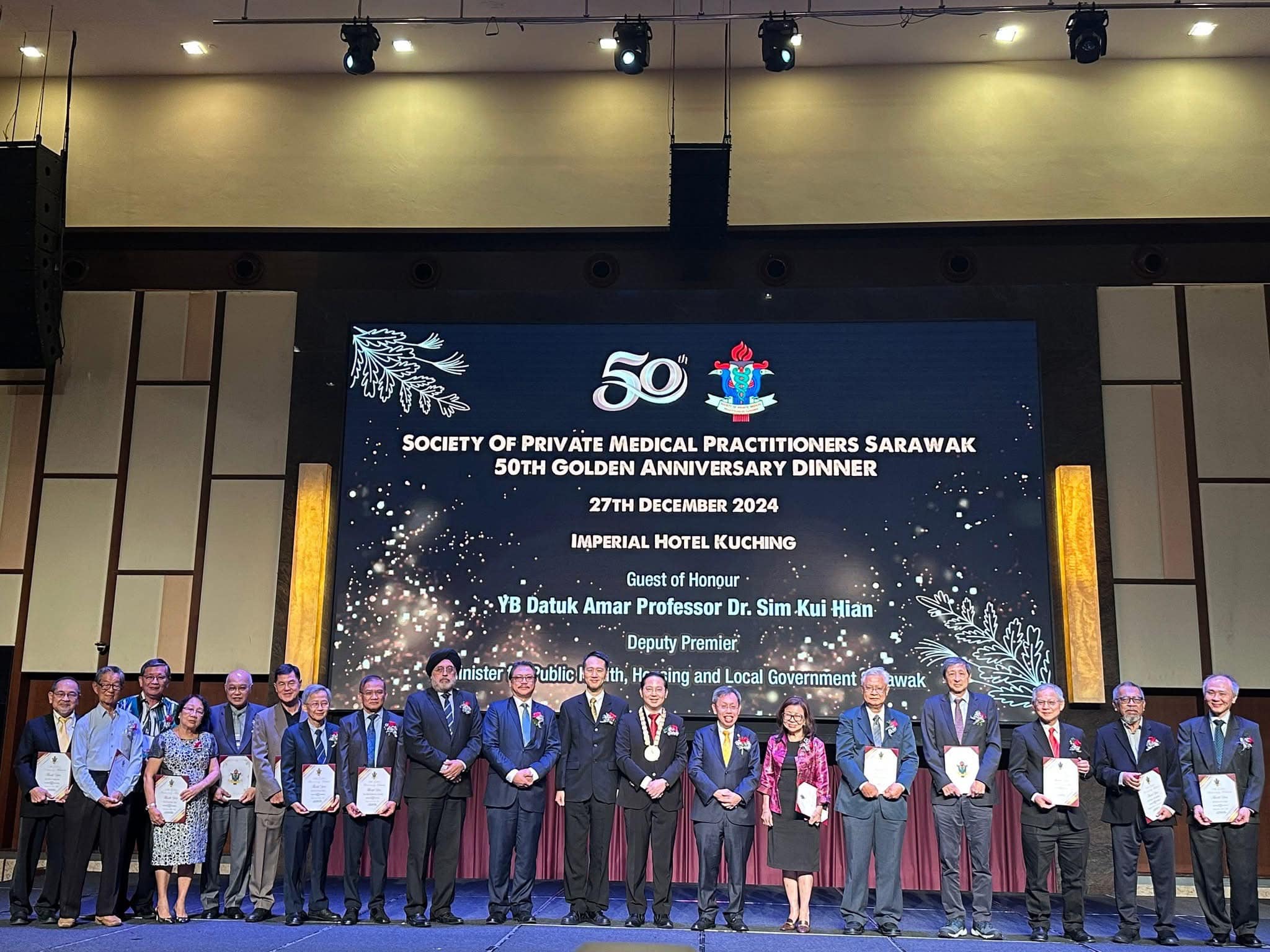Majlis makan malam yang meraikan ulang tahun ke-50 Persatuan ini turut dihadiri oleh Timbalan Premier Sarawak, Datuk Amar Profesor Dr. Sim Kui Hian; Timbalan Menteri Tenaga dan Kelestarian Alam Sekitar, Datuk Dr. Hazland Abang Hipni bersama isteri, Datin Dayang Halimah Abang Paul; Presiden Persatuan Perubatan Malaysia, Dato Dr. Kalwinder Singh Khaira; Pengerusi Persatuan Perubatan Malaysia Sarawak, Dr. Ong Eng-Joe, bersama pasangan mereka serta tetamu kehormat lain. -EDISI UKAS