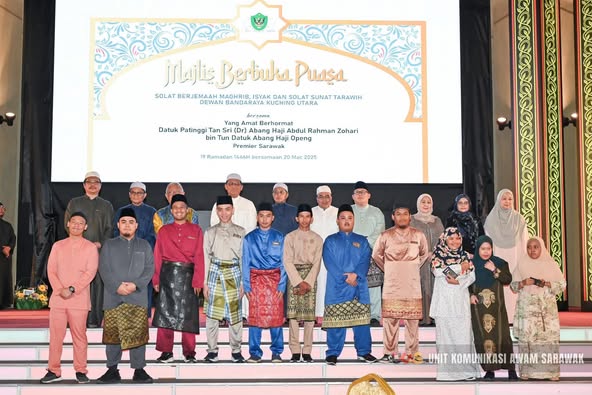 KUCHING: Premier Sarawak Datuk Patinggi Tan Sri (Dr) Abang Abdul Rahman Zohari Tun Datuk Abang Openg udah nyuaka pemeri Ramadan ngagai 20 iku anak patu balu ari Palan Pengintu Pengelantang Datuk Amar Hajjah Jumaani ba Pengerami Buka Puasa Dewan Bandaraya Kuching Utara (DBKU) ba Bengunan Kunsil Nengeri (DUN), kena Hari Empat tu tadi.