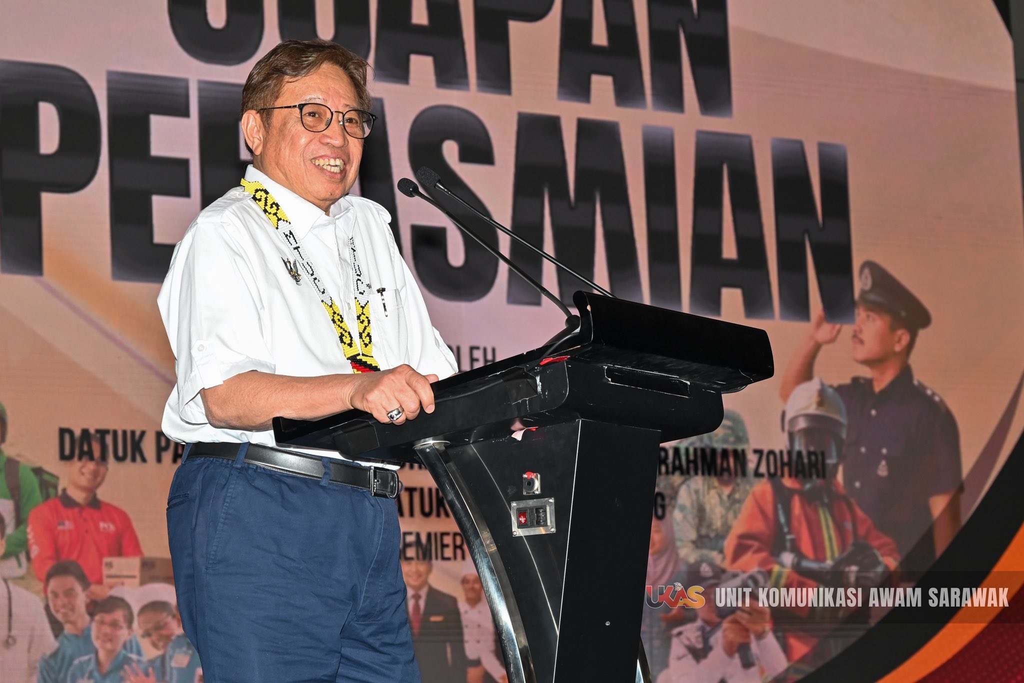 “如果这三个方面关系稳固,我们国家和砂拉越就会进步,那么三方,即雇员、雇主和政府之间必须有联系,像 Ngap Sayot 一样,作为一个团队工作。正是这种Ngap Sayot 的精神,才能够推动砂拉越的发展。”