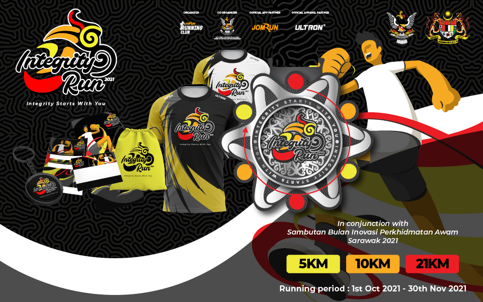 Dimaklumkan Unit Integriti dan Ombudsman Negeri, Jabatan Ketua Menteri Sarawak bersempena dengan Sambutan Bulan Inovasi Perkhidmatan Awam Negeri Sarawak 2021 akan menganjurkan Integrity Virtual Run 2021 . Acara secara virtual ini adalah terbuka kepada semua dengan 3 kategori: • 5km • 10km • 21km Tempoh larian adalah bermula pada 1 Oktober hingga 30 November 2021 .