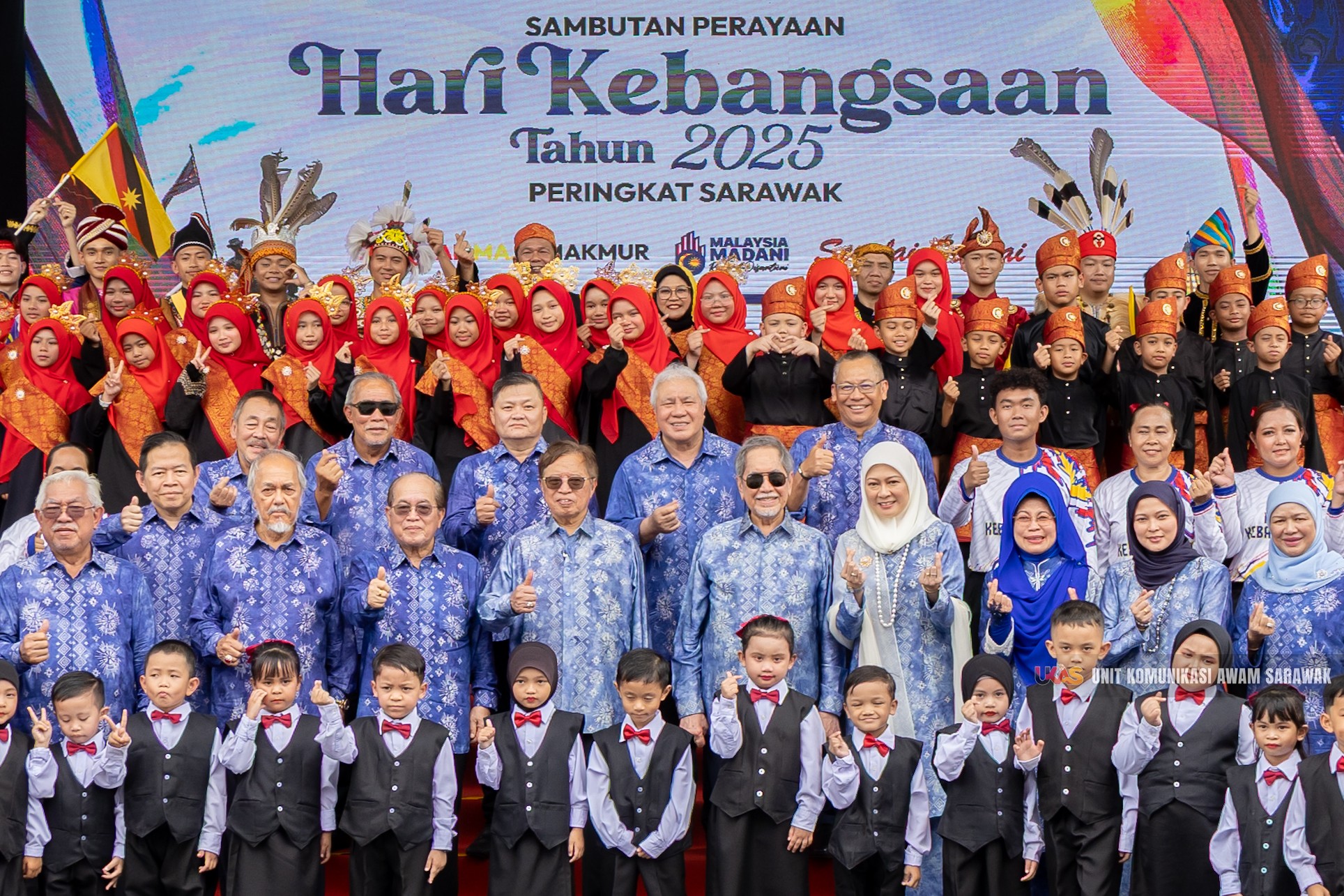 ”让我们以国庆庆典为起点,重振精神,建设更加辉煌的砂拉越和马来西亚。我们不仅以游行或表演来庆祝,更以承诺和决心来庆祝,无论身在何处,我们都将为砂拉越和国家的发展做出贡献。“