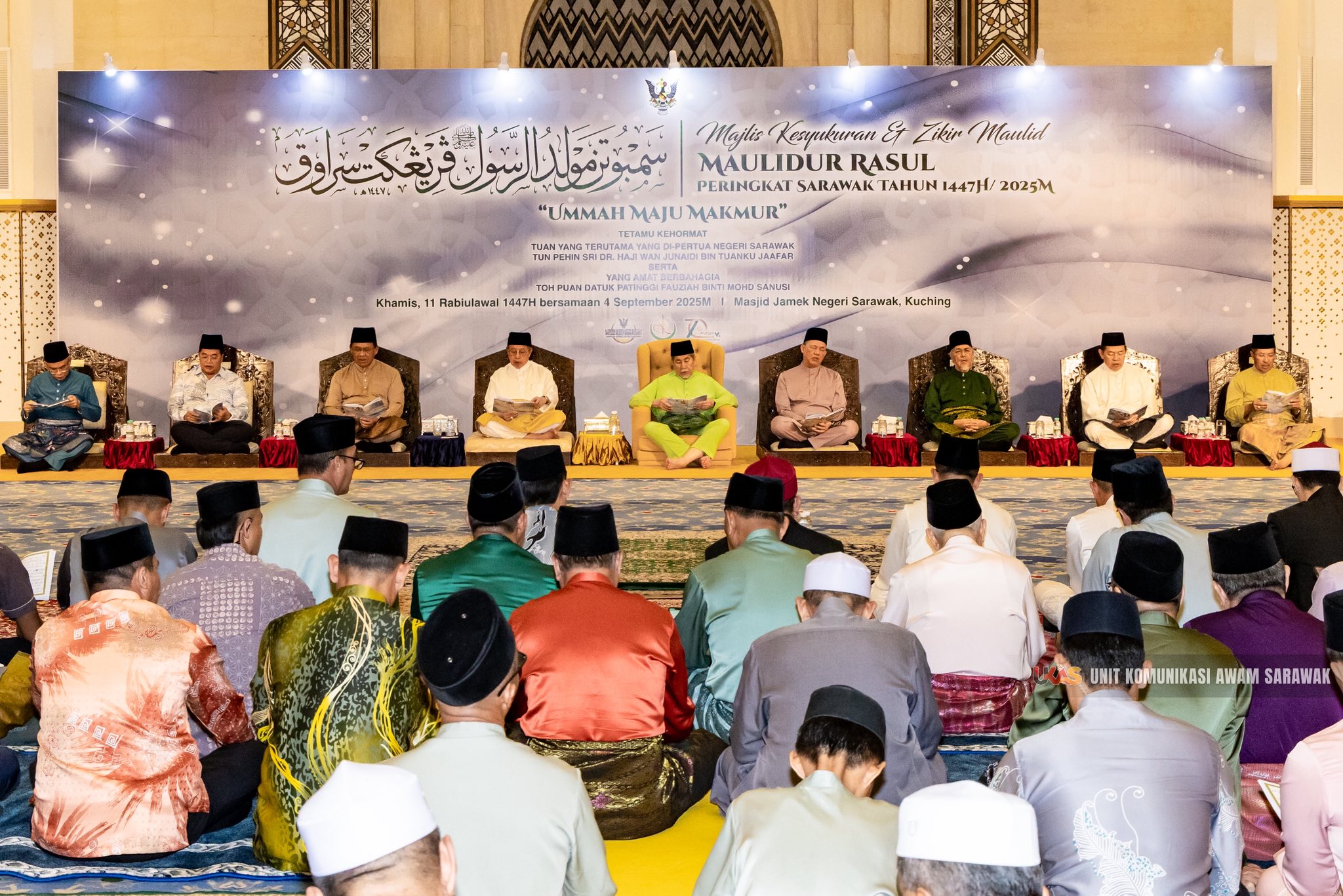 古晋:砂拉越元首敦丕显斯里旺朱乃迪博士和元首后杜潘拿督巴丁宜弗兹雅,以及砂拉越总理拿督巴丁宜丹斯里阿邦佐哈里博士周四出席在砂拉越清真寺举行的2025年砂拉越级先知诞辰1447回历年感恩活动。