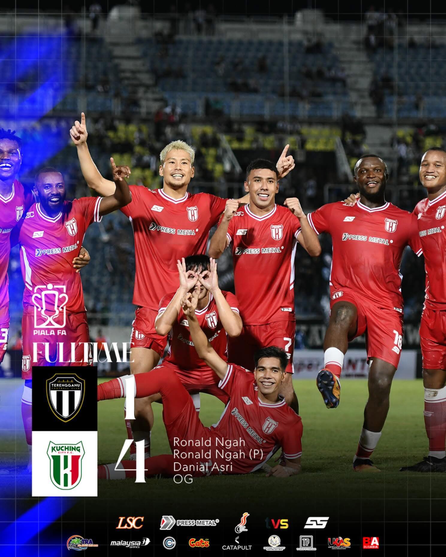 KUALA TERENGGANU: Kuching City FC (KCFC) terus mempamerkan aksi meyakinkan apabila menundukkan Terengganu FC 4-1 dalam saingan suku akhir pertama Piala FA di Stadium Sultan Mizan Zainal Abidin, pada Sabtu.