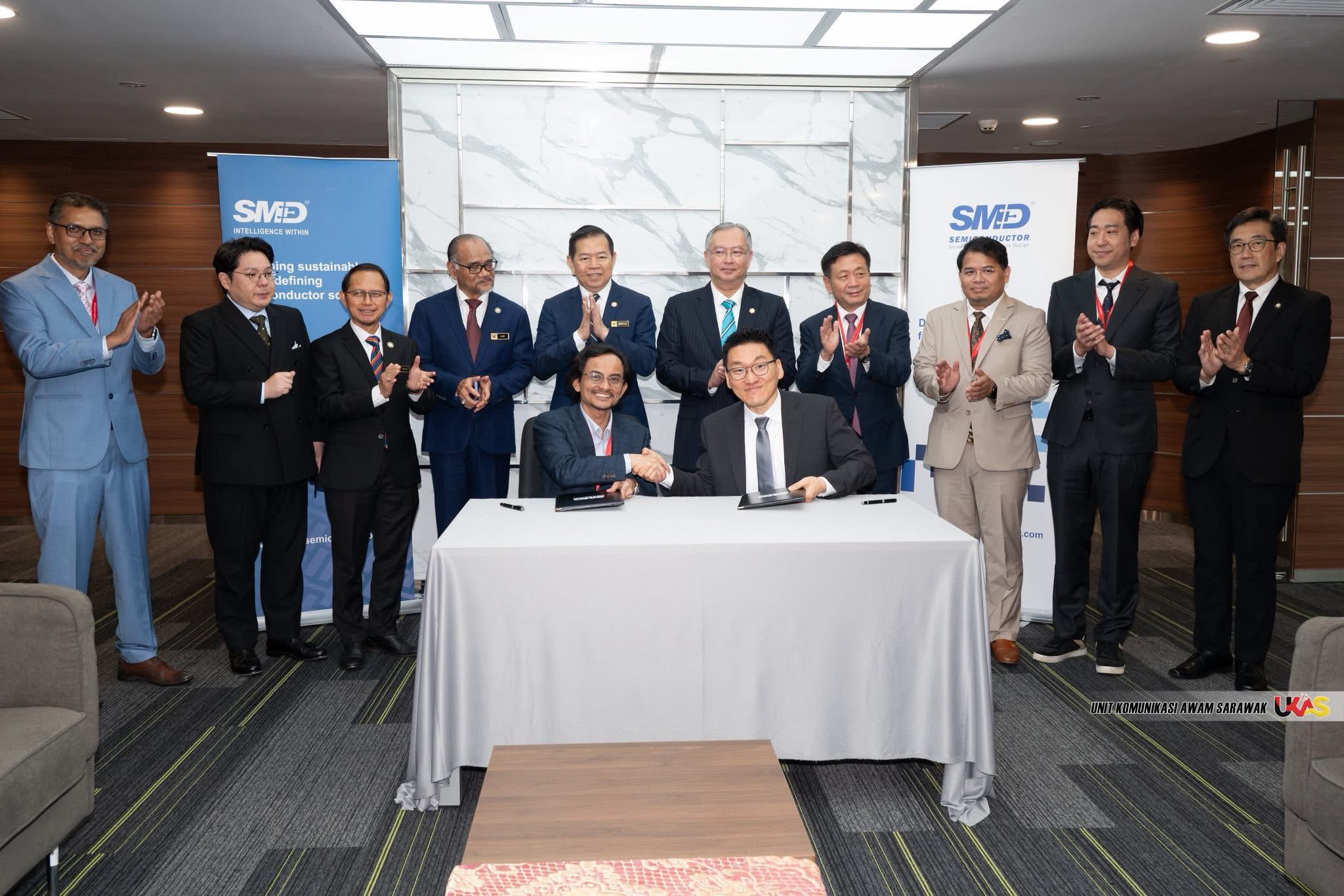 Pengawa nyain MoU nya dikemata Chairman SMD Semiconductor, Dato Sri Dr Wan Lizozman Wan Omar enggau Sapit Sekretari Perintah Sarawak (Perambu Ekonomi & Pemansang), Dato Sri Dr Muhammad Abdullah Zaidel.