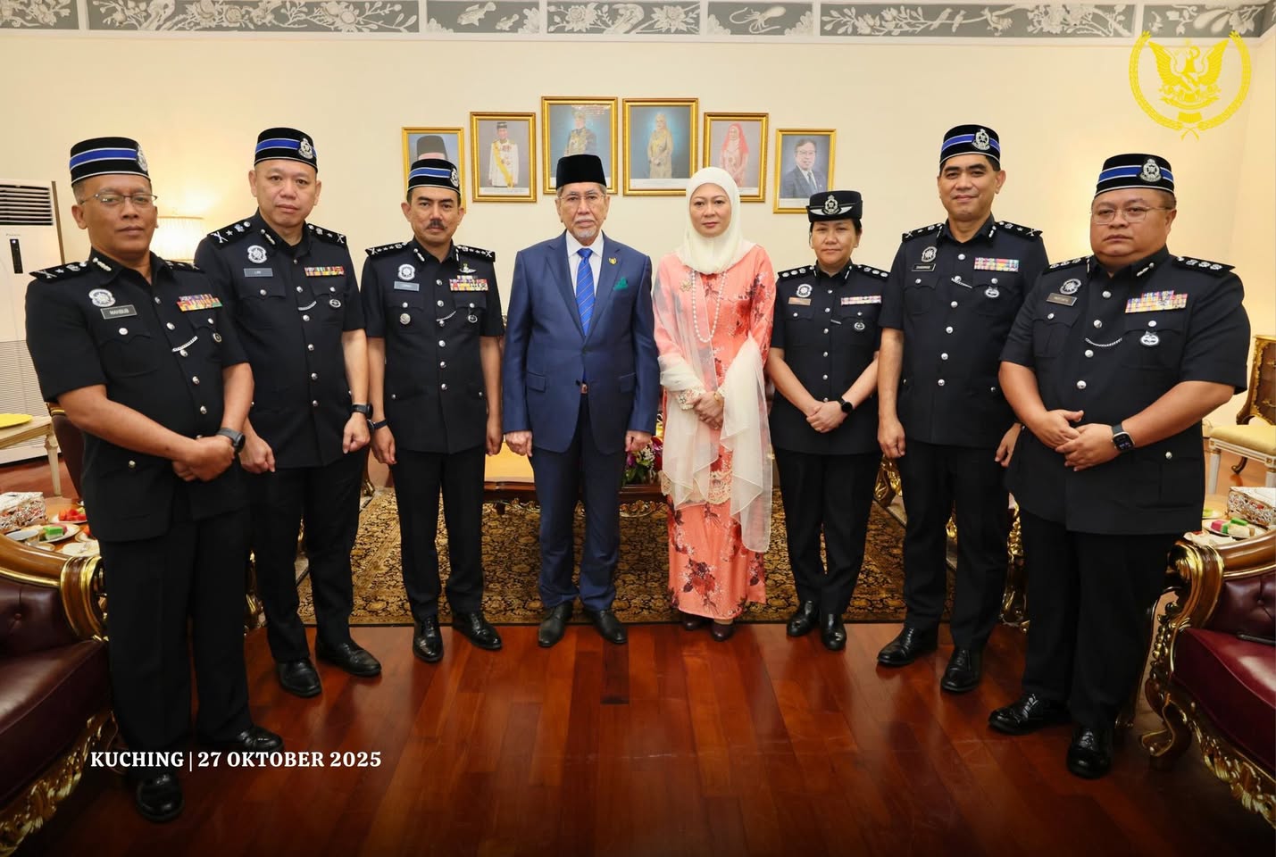 古晋:砂拉越元首敦丕显斯里旺朱乃迪博士及砂元首后杜潘拿督巴丁宜弗兹雅于周一在砂拉越元首府接见新任砂拉越警察总监拿督莫哈末再因阿都拉的拜会。
