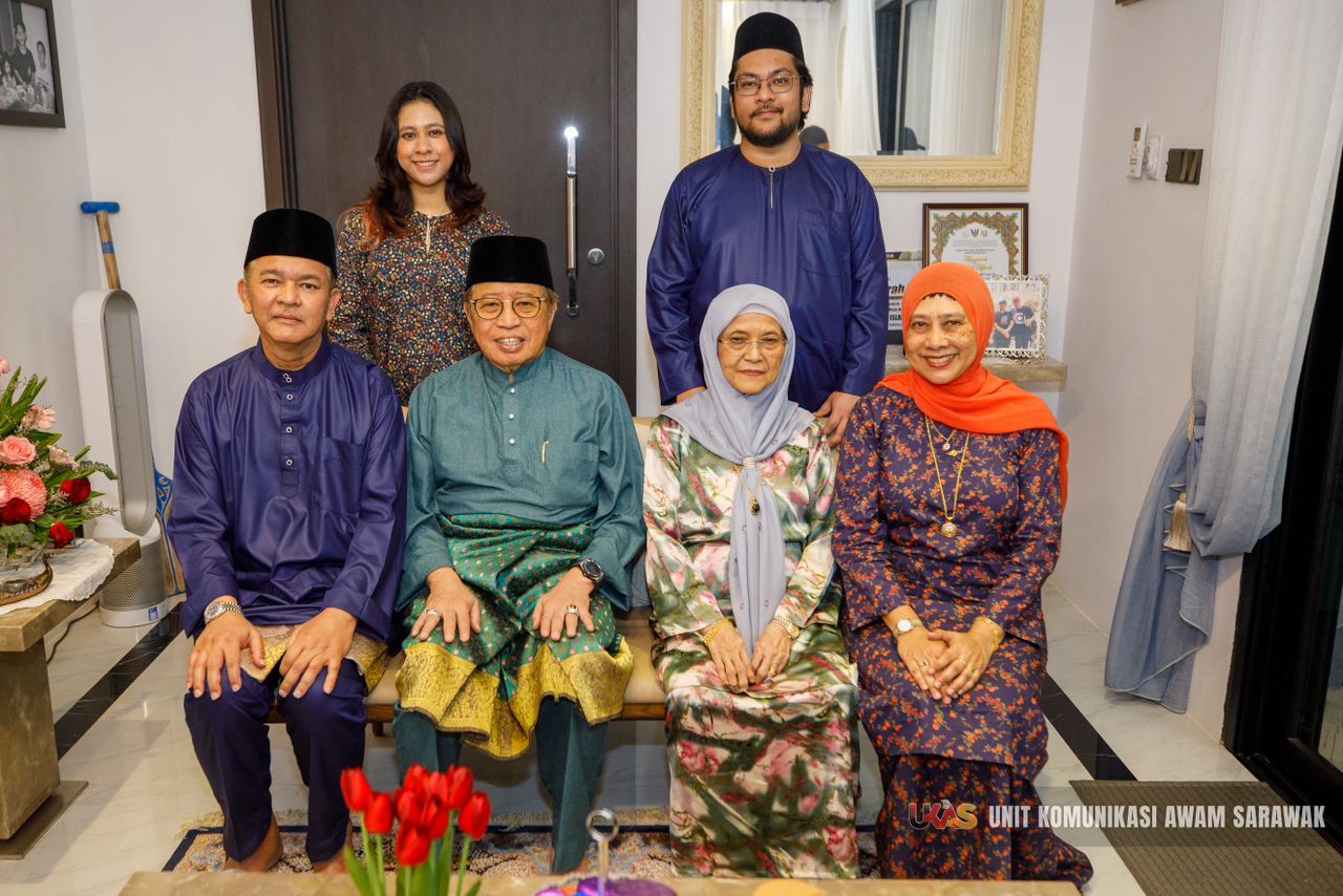 KUCHING: Premier Sarawak, Datuk Patinggi Tan Sri (Dr) Abang Abdul Rahman Zohari Tun Datuk Abang Openg serta isteri Puan Sri Datuk Amar Juma’ani Tun Tuanku Bujang memeriahkan Rumah Terbuka Hari Raya Aidilfitri di kediaman mantan Peguam Besar Sarawak Dato Sri Talat Mahmood Abdul Rashid.