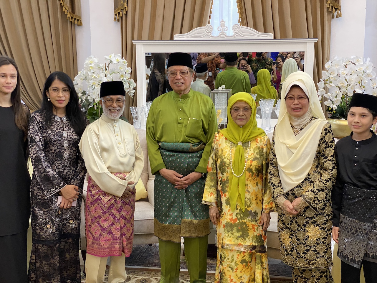 KUCHING: Premier Sarawak, Datuk Patinggi Tan Sri Dr Abang Abdul Rahman Zohari Tun Datuk Openg enggau bini iya Puan Sri Datuk Amar Juma’ani Tun Tuanku datai ngerichah Pengerami Nerima Pengabang Hari Raya Aidilfitri Menteri Pemansang Indu, Nembiak Mit enggau Pengelantang Komuniti Dato Sri Fatimah Abdullah, sehari tu.