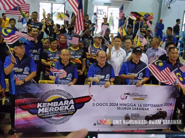 Sama datai, Kaban Parlimen Betong Dr Richard Rapu, Residen Sitak Betong Richard Micheal Abunawas, DirektorPemadah Sarawak Ke Nyadi Tuai Konvoi Kembara Merdeka Jalur Gemilang 2024 Helmy Hamid, Pegawai Pelilih Betong Alfred Geling Ason sereta bala tuai raban bansa ke bukai.-EDISI UKAS